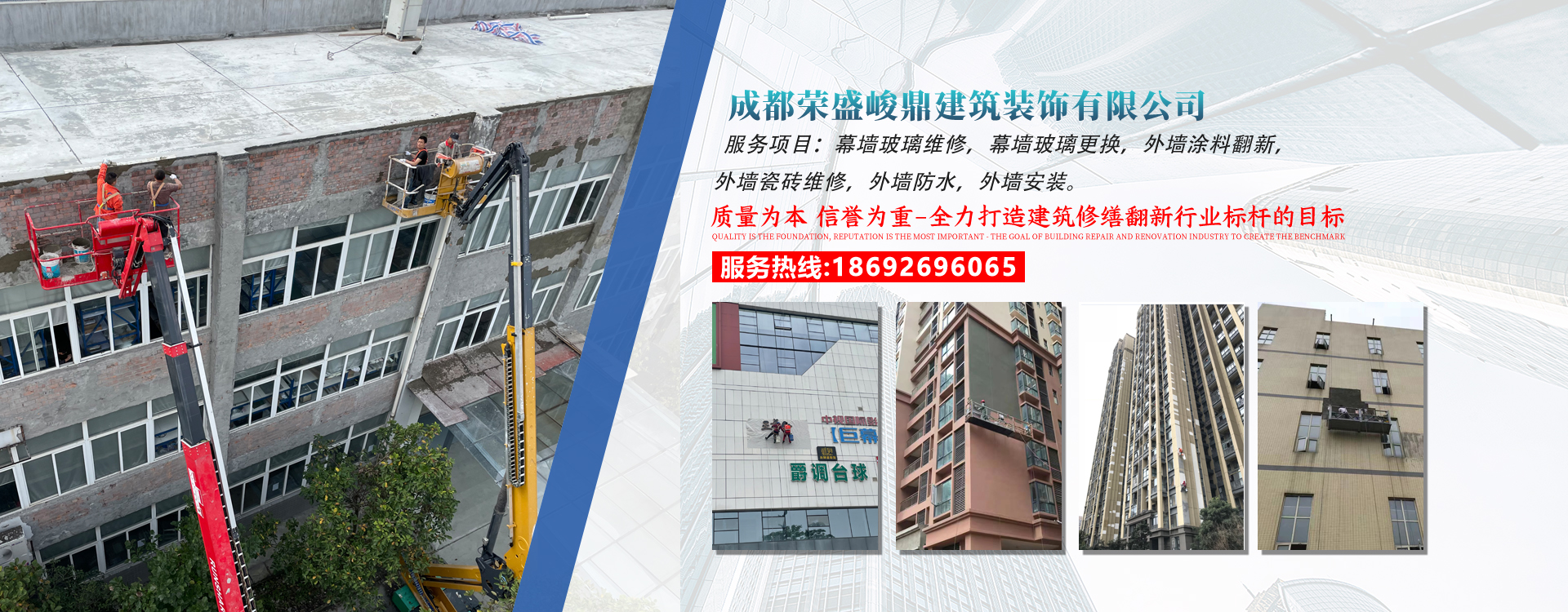 成都榮盛峻鼎建筑裝飾有限公司始終堅(jiān)持發(fā)揚(yáng)工匠精神的專(zhuān)業(yè)施工團(tuán)隊(duì),專(zhuān)業(yè)于舊建筑修繕?lè)碌难芯颗c實(shí)踐;服務(wù)包括外墻維修、外墻翻新、外墻磚維修、外墻防水處理、內(nèi)外墻涂料維修、幕墻玻璃維修、門(mén)...